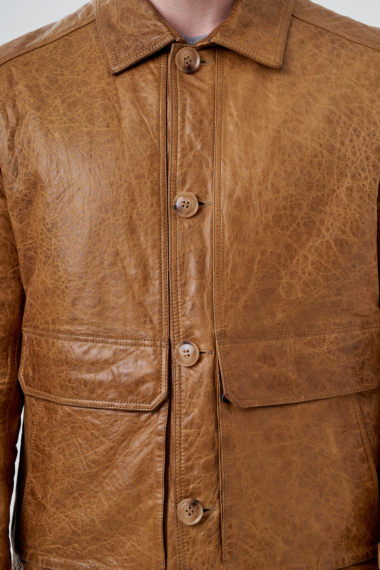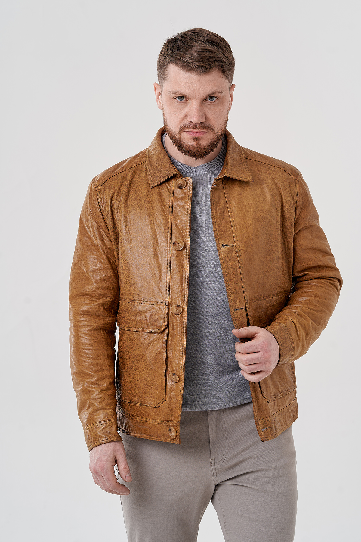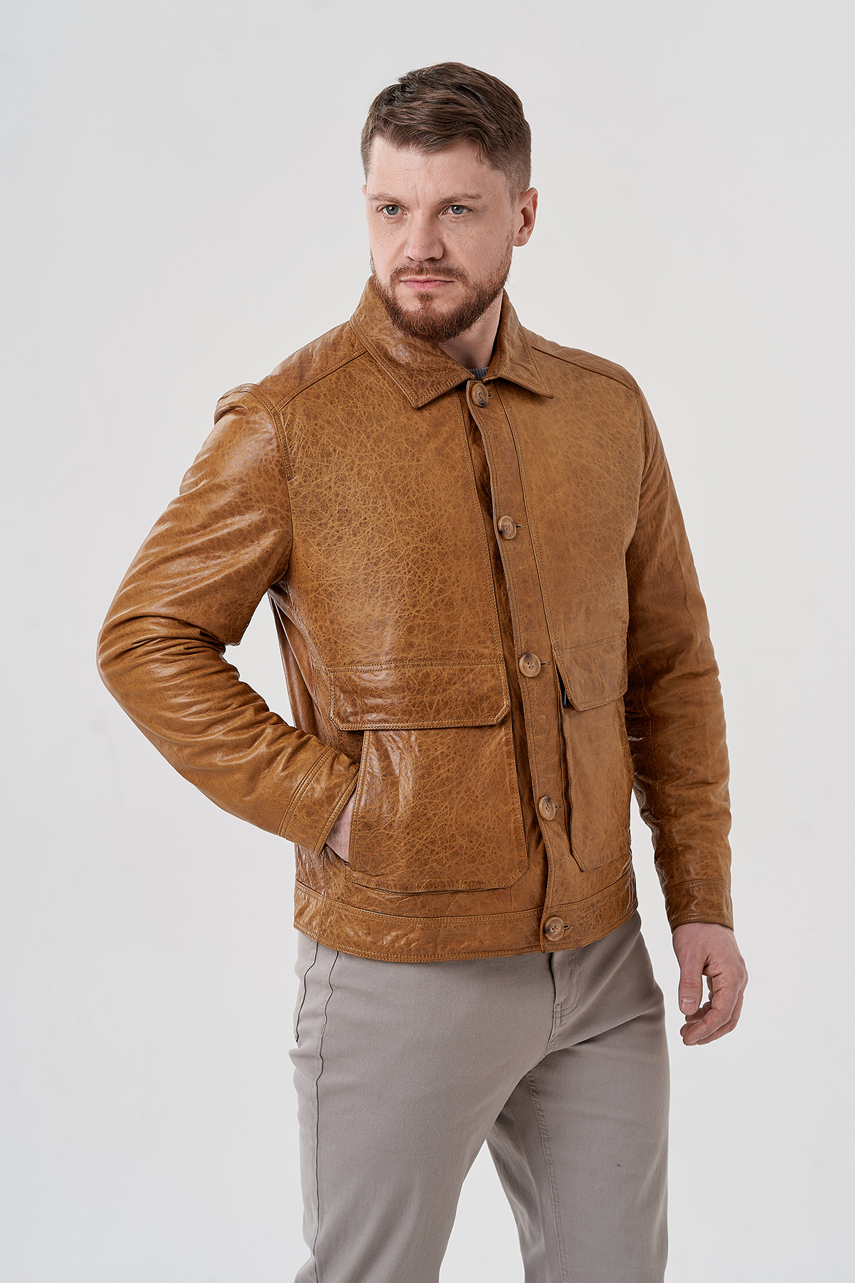 Мужская куртка бежевого цвета. Выполнена из натуральной кожи с оригинальным тиснением. Подклад из полиэстера. Застегивается на пуговицы. Для удобства расположены карманы с клапанами. Отложной воротник и застежки на кнопки на рукавах. Длина 70 см кофмортная и не будет стеснять движений.