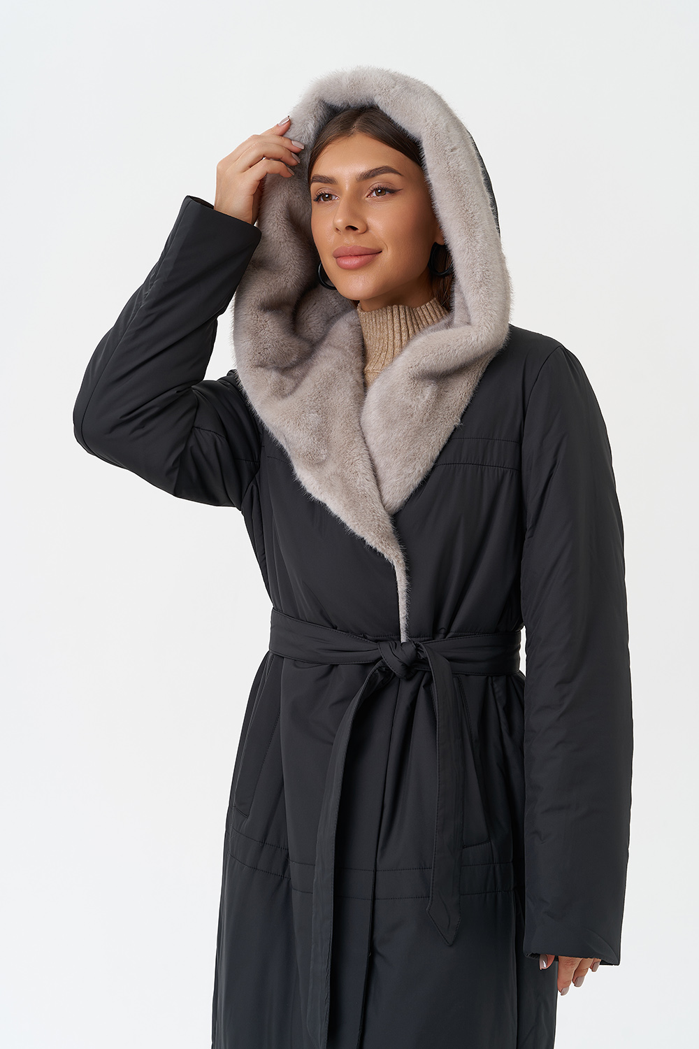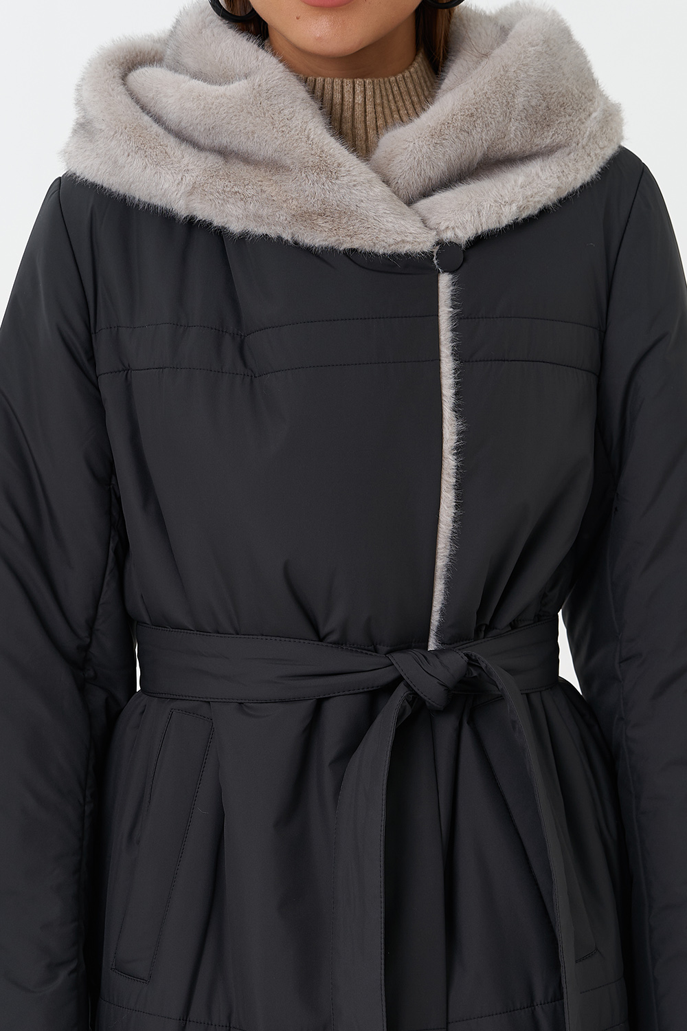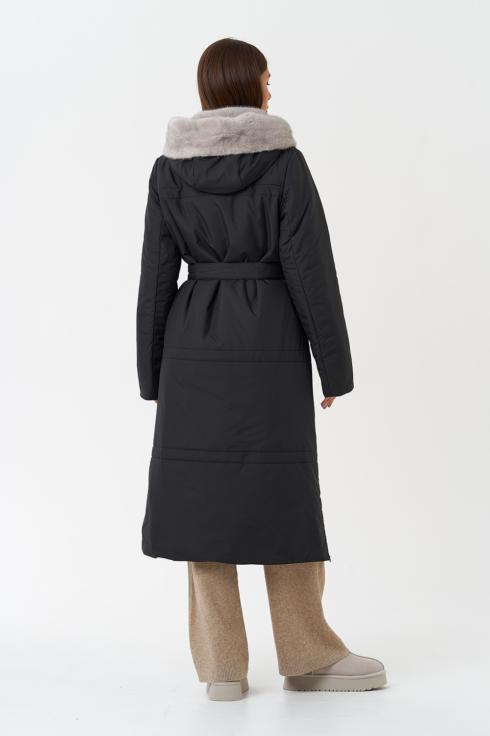 Крой воротника - капюшон, отделка эко мех под норку
