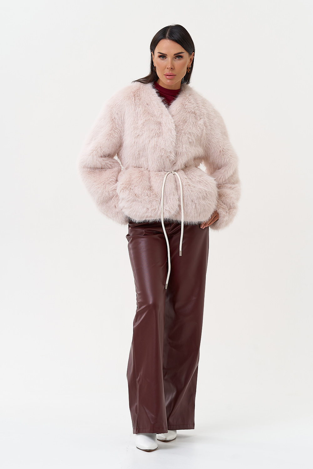 Фасон - прямой Длина изделия - 60 см Цвет - розовый (персиковый) Материал - экомех Состав полотна - полиэстер 100% Подкладка - полиэстер 100% Вид застежки -крючки, пояс Вид ворота - V-образный Фасон рукава - спущенное плечо, длинный |