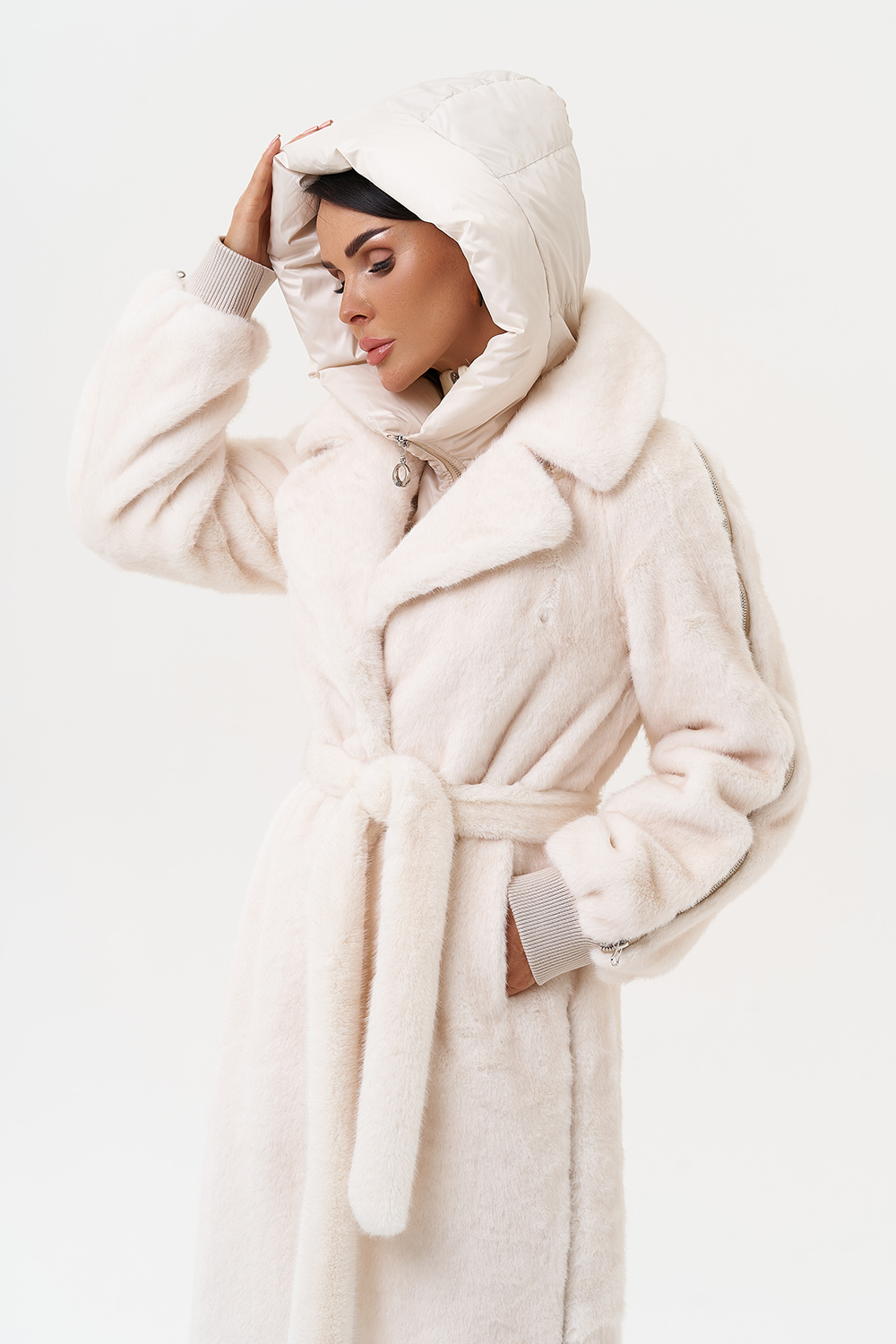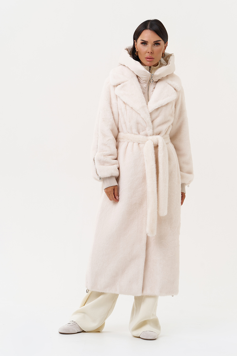 Фасон - прямой Длина изделия - 120 см Цвет - светло-бежевый (молочный) Материал - экомех Состав полотна - полиэстер 100% Подкладка - полиэстер 100% Вид застежки - крючки, пояс Вид ворота - съёмный капюшон, английский воротник Фасон рукава - реглан, длинный |